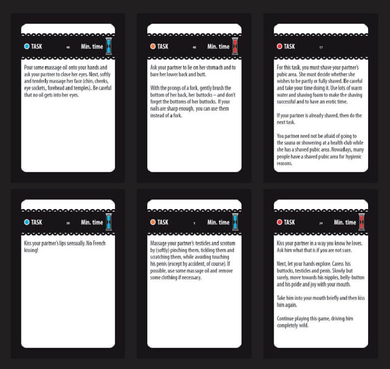 Đồ dùng tùy chọn siêu tiện lợi: dầu massage, gel bôi trơn, khăn bịt mắt, dây giày, nhạc gợi cảm, kẹp giấy, thìa nĩa, kem cạo râu + dao sạch, khăn lớn, đá viên, kem tươi hoặc trái cây tươi. Không có sẵn? Chọn nhiệm vụ thay thế ngay!